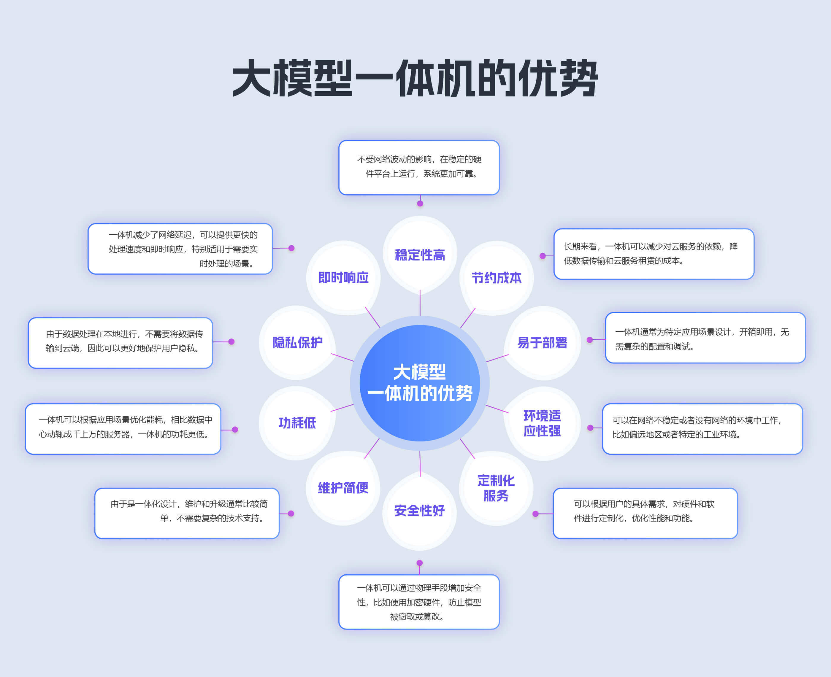 将大型的AI模型直接集成到硬件设备中,使大模型可以在没有外部服务器或云端支持的情况下独立运行。清湛大模型训推一体机 集成了大模型训练和推理功能并内置了人工智能大模型"全栈式" 软件的设备,包含CPU(中央处理器)、GPU(图形处理器)、存储器、操作系统、深度学习模型等软硬组件,能通过数据训练掌握数据处理和预测等能力。