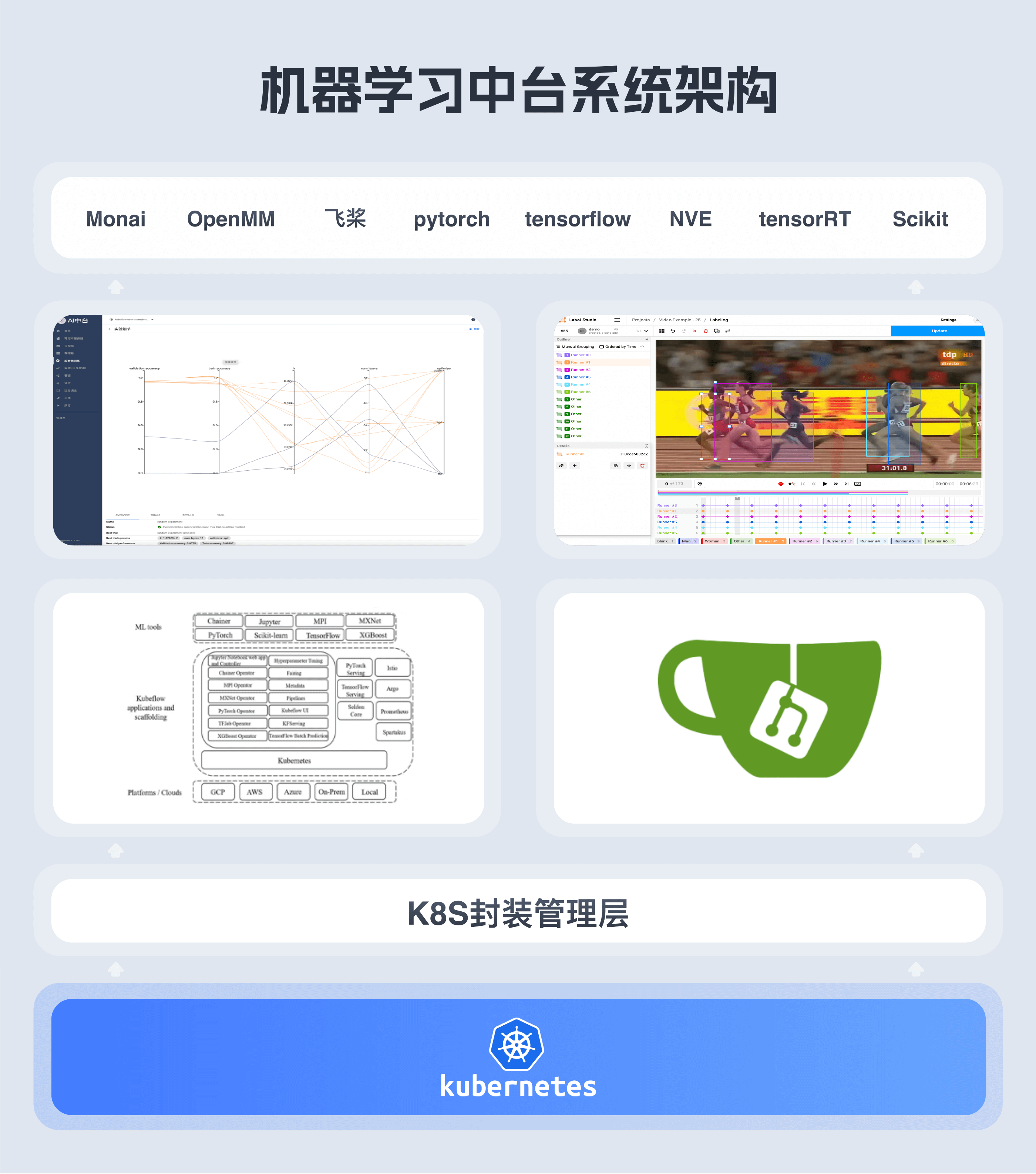 平台采用容器轻量级虚拟化方式作为基础,实现对多集群多节点 的GPU、CPU、内存、存储等基础设施资源池化;基于Kubernetes 定制化开发的编排调度工具,实现资源高效灵活调度;同时企业级设计理念使平台具备多租户多层级用户管理、权限管理、资源管理、vGPU 等丰富的平台能力,全方位满足用户对 AI 开发平台高可用、高可靠、高稳定要求。平台为用户提供简洁的WEB 界面,丰富的功能以及多样化工具。如开发模块提供一键式环境生成、在线交互式开发工具Mlab;模型训练提供参数调优、分布式并行训练等;模型服务提供在线模型部署推理、模型服务调用;平台同时集成数据标注工具、镜像仓库等,实现一站式AI开发。深度学习框架镜像以插件的方式接入系统,集成了多种业界常用框架,如 Tensorflow,Caffe,PyTorch和MXnet等,支持自定义扩展,极大提升整体系统 的扩展性和可维护性。管理端为管理员提供可视化的运维运营体系,如资源监控、资源计量计费、 资源配额管理、日志监控、用户及用户组管理、权限管理等,降低用户在运维上的投入。