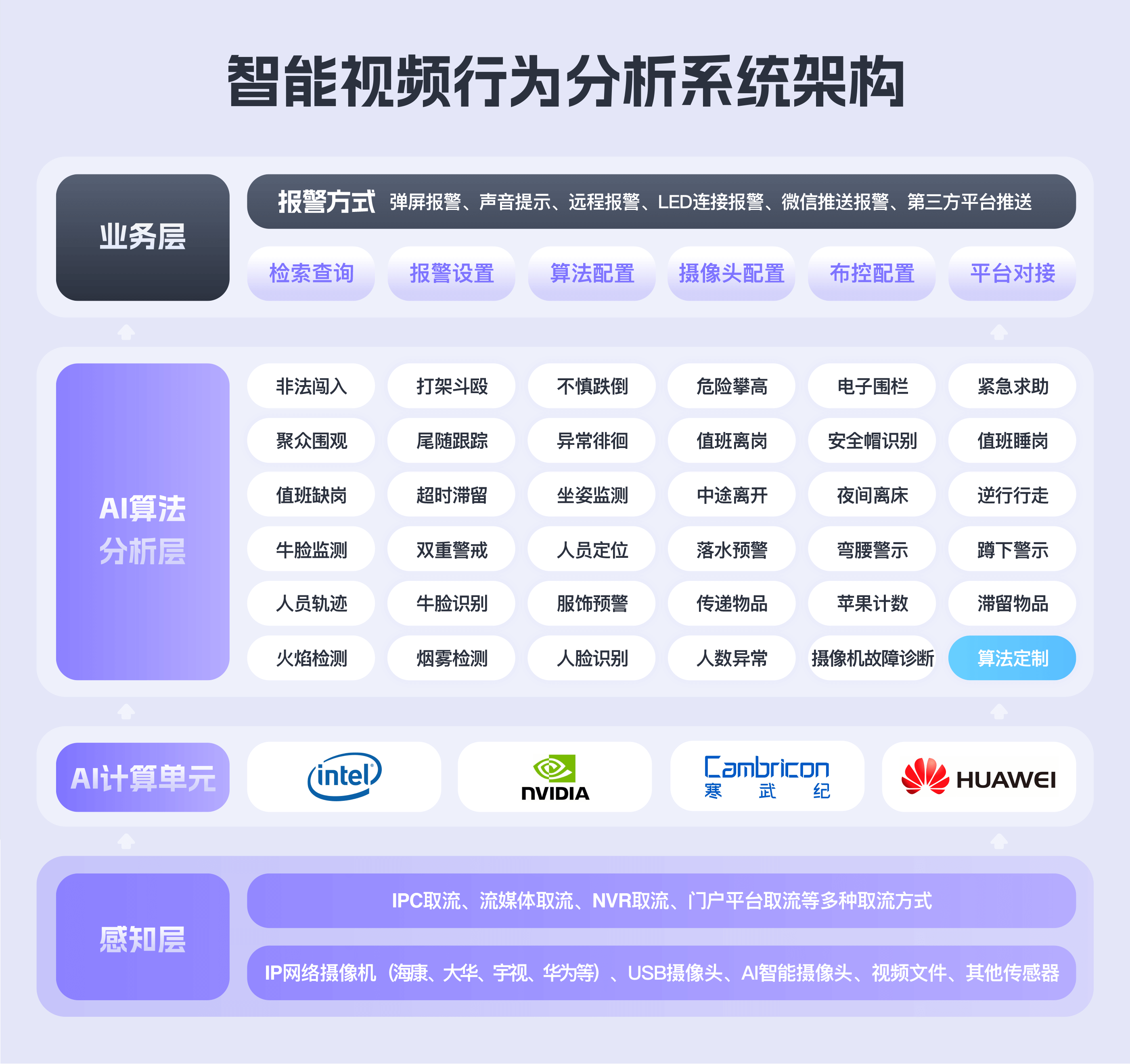 清湛人智院基于自主研发的"智能视频行为分析技术",能够从纷繁复杂的像画面中提取物体的特性、特征,正确识别出不同物体及其运动轨迹规律,特别是以往运动检测方式下无法实现与应用的场合,一旦发现监控画面中"关键目标"出现时,系统能够以最快、最佳的方式提供有用信息或告警,"智能视频行为分析"系统将有效地提高报警的精确度,同时拓展了视频报警的应用范围。
